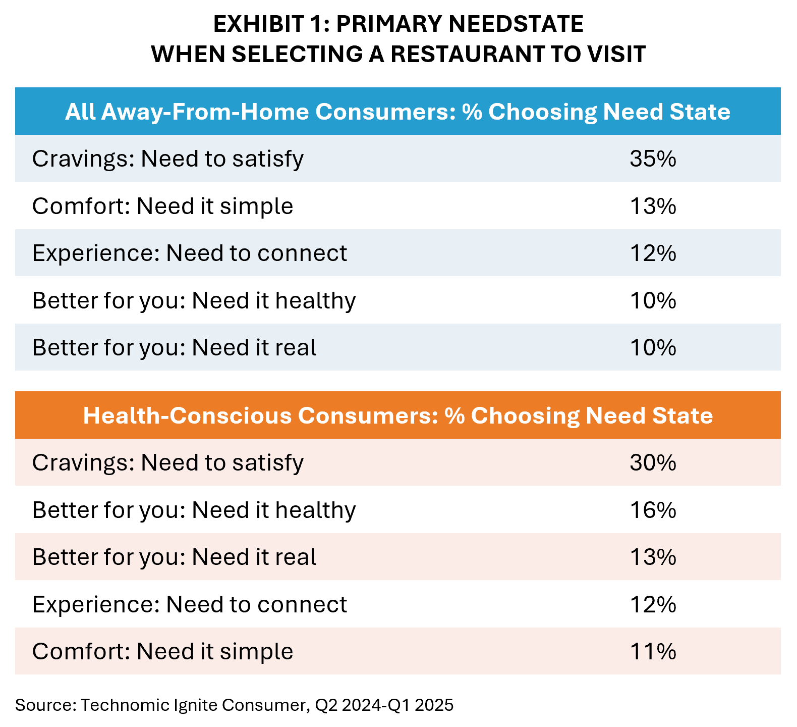 For 20% of today’s consumers, “better for you” is the primary need state when choosing a restaurant. That said, cravings are still the top need state overall, even for those away-from home consumers who identify as being health-conscious (See Exhibit 1). Still, while craveability remains the most common need state, more than half of consumers want restaurants to offer more healthy food options, an increase of 3 points compared to just six months ago (See Exhibit 2). This suggests that, when targeting occasions where patrons eat healthier, it is important to develop menu items that balance both craveability and better-for-you benefits.