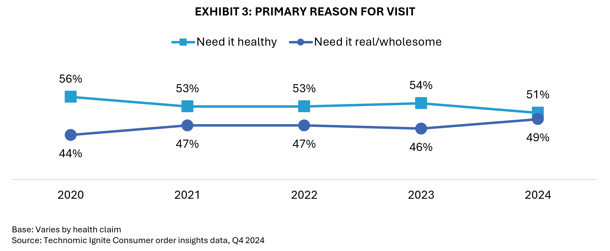 The meaning of health is becoming more individualized, making it difficult to settle on a single definition. Among consumers identifying a better-for-you need state for a recent occasion, however, we see the definition is shifting from saying they “need it healthy” and indicating growing interest in “need it real/wholesome” (See Exhibit 3). This shift is expected to continue, as real and wholesome foods are more likely to be perceived to offer positive health benefits without detracting from taste.