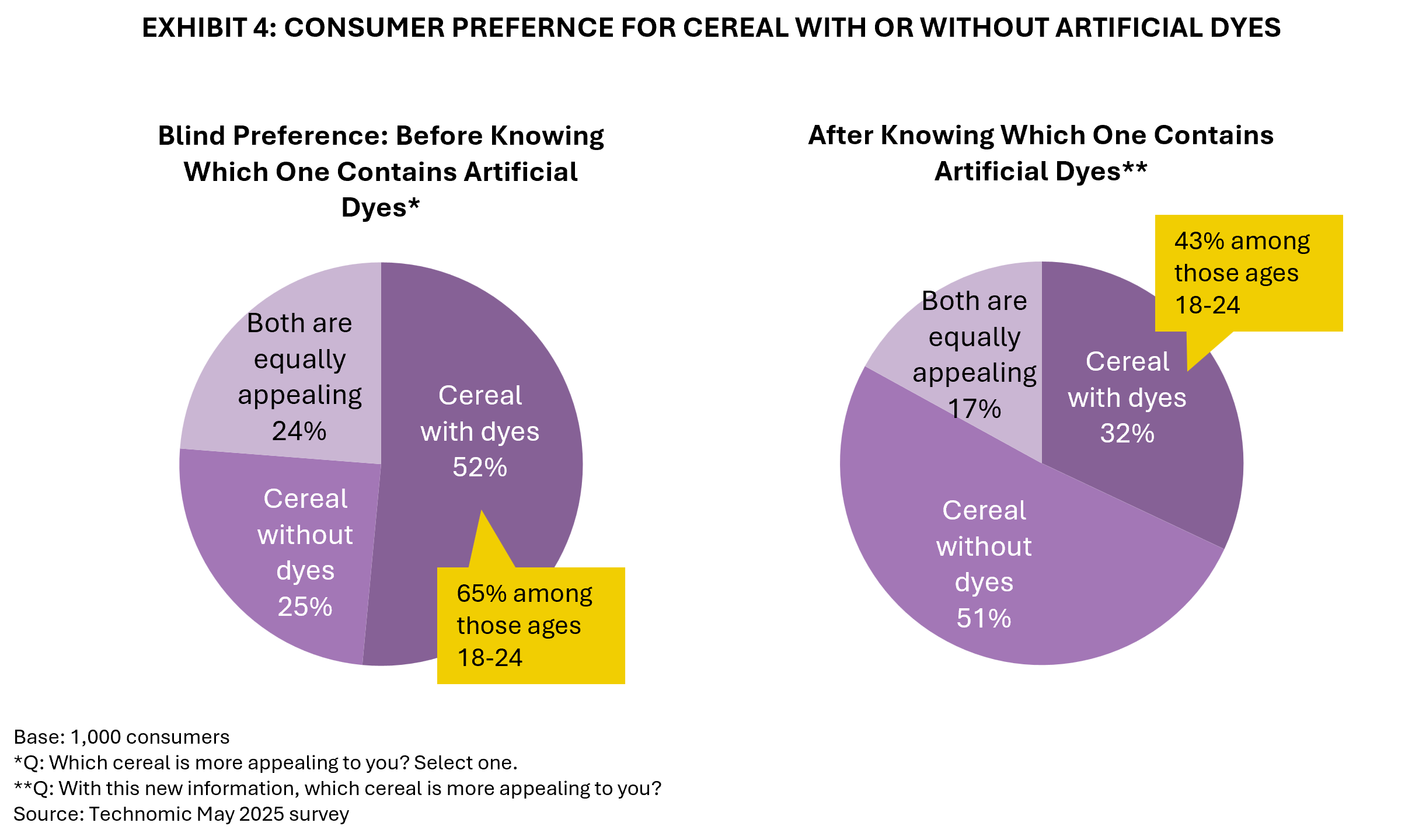 In the case of dyes, the data in Exhibit 4 suggests consumers may be accepting of the color change of their foods, despite a long-held belief that consumers “eat with their eyes.” But will they be as accepting of other changes recommended by MAHA? For example, seed oils that are widely in use but targeted by MAHA have an impact on the taste and texture of the food, as well as ingredient costs. Will consumers be as accepting of those changes?