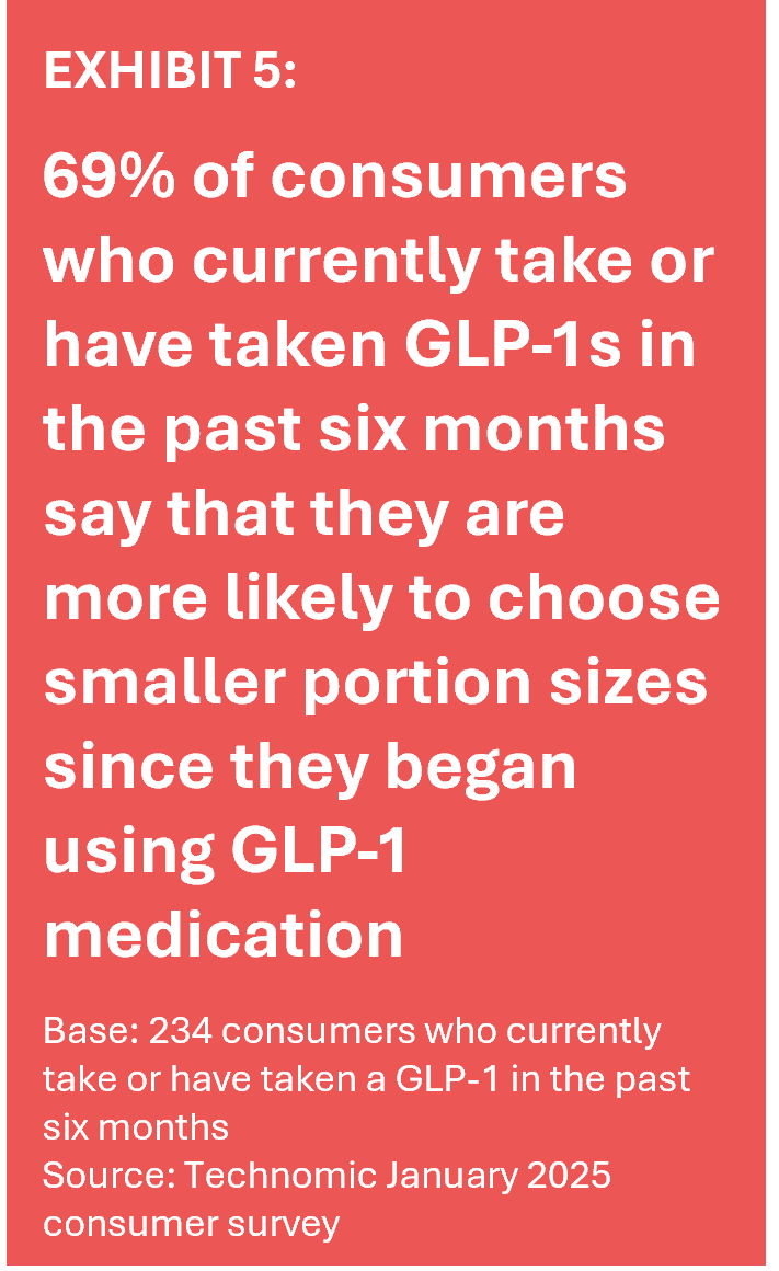 Any discussion of healthy eating must now touch on the use of weight loss drugs. A recent Technomic survey shows that 11% of consumers are currently taking a GLP-1* as consumers continue to seek ways to manage chronic health conditions or weight loss. It’s growing use has led many to wonder what the longer-term impacts of these drugs will be on the industry. It’s worth noting that our research shows GLP-1 users are most likely to say they choose healthy food and beverage away from home only sometimes (37%), rather than most of the time (28%).* That’s similar to the results for non-GLP-1 users (41% sometimes versus 25% most of the time).* This suggests even those on weight loss drugs want to indulge away from home. They are, however, more likely to feel sated morequickly, so a variety of portion sizes may be valued (See Exhibit 5).
