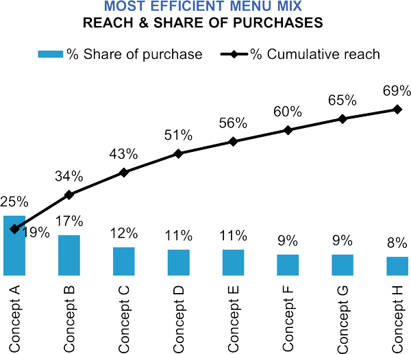 This methodology also enables a wholesale search for the most efficient menu within size constraints. For example, let's say we are testing a menu that presently has 12 items on it. We tested those 12 items in addition to another five potential new items to consider. In this instance, it was decided that for operational efficiencies sake that the menu needed to be simplified and the customer desired to reduce this section of the menu to eight items. The simulator can identify which combination of the 17 items can satisfy the most people. By comparing the reach of the original menu to the recommended menu, we can measure the potential risk to customer satisfaction by this planned reduction.