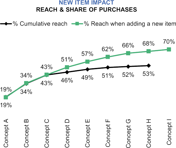 MaxDiff methodologies enable us to simulate and forecast the impact of implementing different menu-mix scenarios. This particular scenario was one where a client was looking to test which menu item in their innovation pipeline extended the incremental reach of their menu the furthest. Combining this metric with additional contextual insights helps identify whether a new menu item is truly additive to the current menu mix.