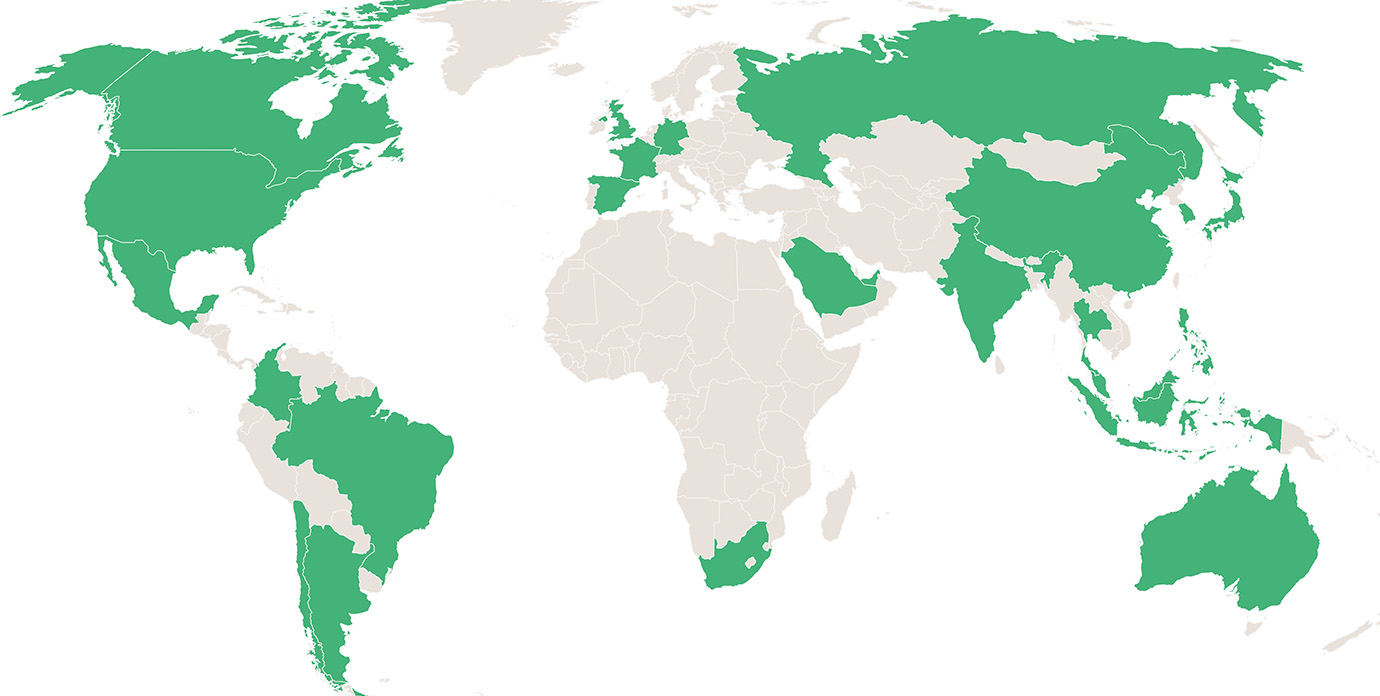 Argentina, Australia, Brazil, Canada, Chile, China, Colombia, France, Germany, India, Indonesia, Japan, Malaysia, Mexico, Philippines, Russia, Saudi Arabia, Singapore, South Africa, South Korea, Spain, Thailand, United Arab Emirates, United Kingdom and United States